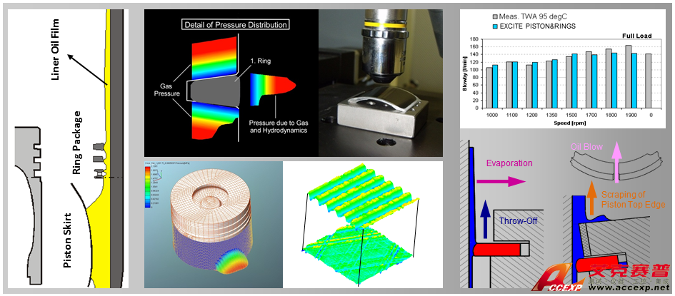 Accexp解決方案EXCITE PISTON&RINGS考慮潤滑、燃氣以及彈性體間的相互關系,分析評估活塞二階運動及活塞拍擊噪聲,同時也可對活塞型線、活塞銷偏置等進行參數敏感性分析。在此基礎上,評估活塞環(huán)運動、環(huán)后壓力以及引起竄氣與機油消耗的預測,也可對環(huán)組運動表面進行分析,如液動摩擦損失、缸套與活塞環(huán)磨損等。