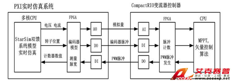 整個(gè)系統(tǒng)的方案設(shè)計(jì)如上,系統(tǒng)硬件由2部分組合,第一部分是CompactRIO(NI公司提供的一種工業(yè)計(jì)算機(jī)),作為風(fēng)機(jī)變流器的控制器,通過(guò)運(yùn)行雙饋風(fēng)機(jī)的空載與并網(wǎng)控制算法來(lái)發(fā)送PWM信號(hào)對(duì)變流器里的IGBT進(jìn)行控制。第二部分是PXI與FPGA板卡,作為雙饋風(fēng)機(jī)系統(tǒng)的實(shí)時(shí)仿真器。 兩個(gè)硬件平臺(tái)通過(guò)IO板卡接口,并且這個(gè)接口和控制器控制真實(shí)的雙饋風(fēng)機(jī)設(shè)備完全一致,即控制器從仿真器采集電網(wǎng)電壓、電流、編碼器信號(hào)等;然后經(jīng)過(guò)控制算法的運(yùn)算后,向仿真器發(fā)出控制IGBT開(kāi)通和關(guān)斷的PWM信號(hào)。
