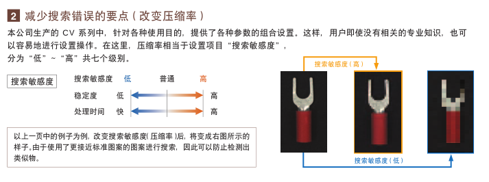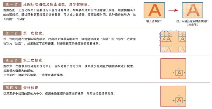 除了利用正規(guī)化相關(guān)法的圖案搜索之外,還有一種基于檢測對象輪廓的 “ 幾何形狀搜索 ”。本公司生產(chǎn)的 CV 系列“ShapeTrax” 就具有這樣的功能。“ShapeTrax” 根據(jù)輪廓數(shù)據(jù)進(jìn)行搜索,因此在搜索對象有缺損時(shí),也可以根據(jù)殘留的形狀數(shù)據(jù)進(jìn)行正確的搜索。除此之外,還可以根據(jù)對象的尺寸的變化、黑白反轉(zhuǎn)等表面狀態(tài)的變化做出正確的處理,從而可以確保檢查效果。