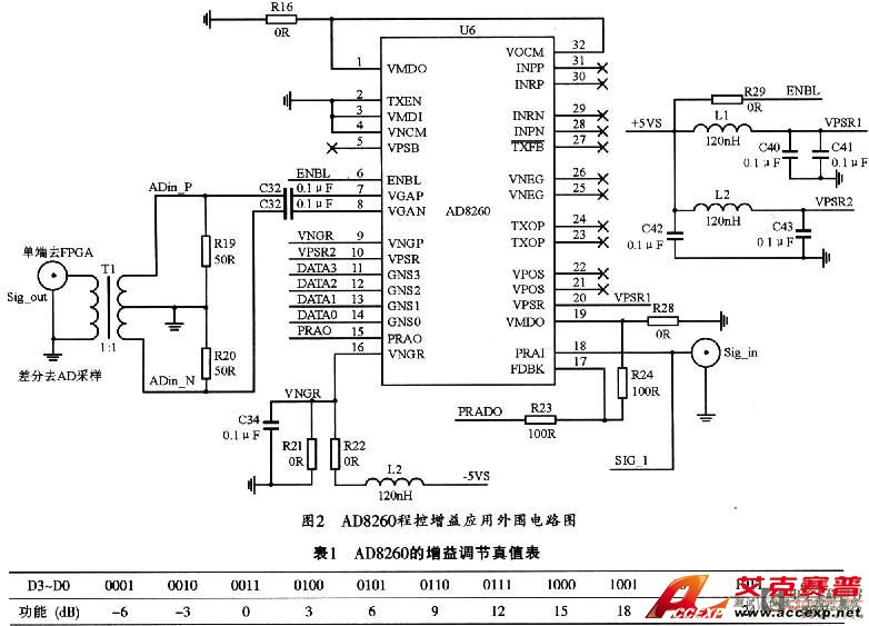 圖2所示是AD8260的外圍電路,其中AD8260芯片采用±5 V雙電源供電,也可以通過跳線實現+3.3V單電源供電。即將-5VS接地,R21焊接,R22斷路,+5VS接+3.3 V。