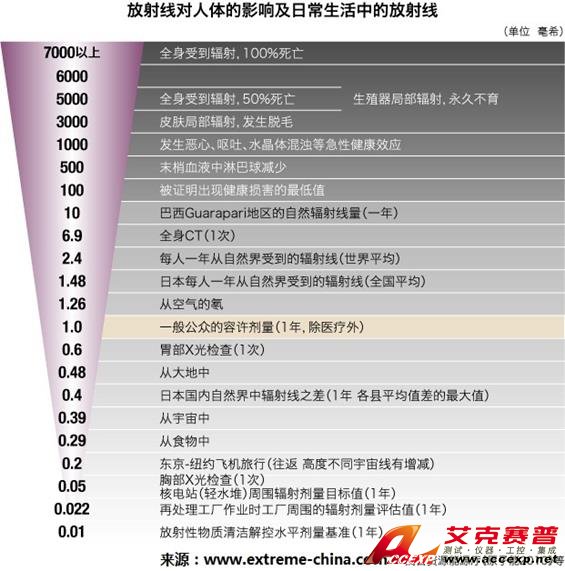 環境中本身存在的各種放射線輻射對人體是無害的,取決于包括大氣情況和地理位置各種各樣的因素,全世界核發輻射平均水平在約0.05 μSv/hr - 0.40 μSv/h之間,在中國,這個值是約0.13~ 0.25μSv/h左右。但是, 真正需要關注的問題不僅包括環境本底以外的輻射的強度 ,更值得注意的是輻射的累積效用。