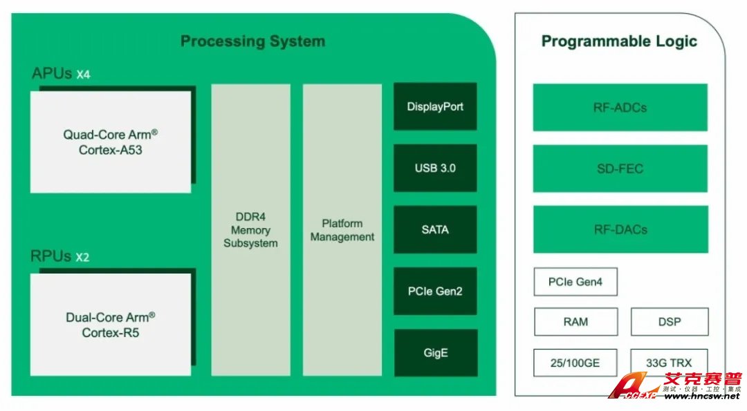 除了系統(tǒng)的 FPGA 架構(gòu)部分,Xilinx UltraScale+ RFSoC 還配備了四個板載應(yīng)用處理單元 (APU) 和兩個實時處理單元 (RPU),適用于需要板載嵌入式操作系統(tǒng)進(jìn)行獨立操作的應(yīng)用。