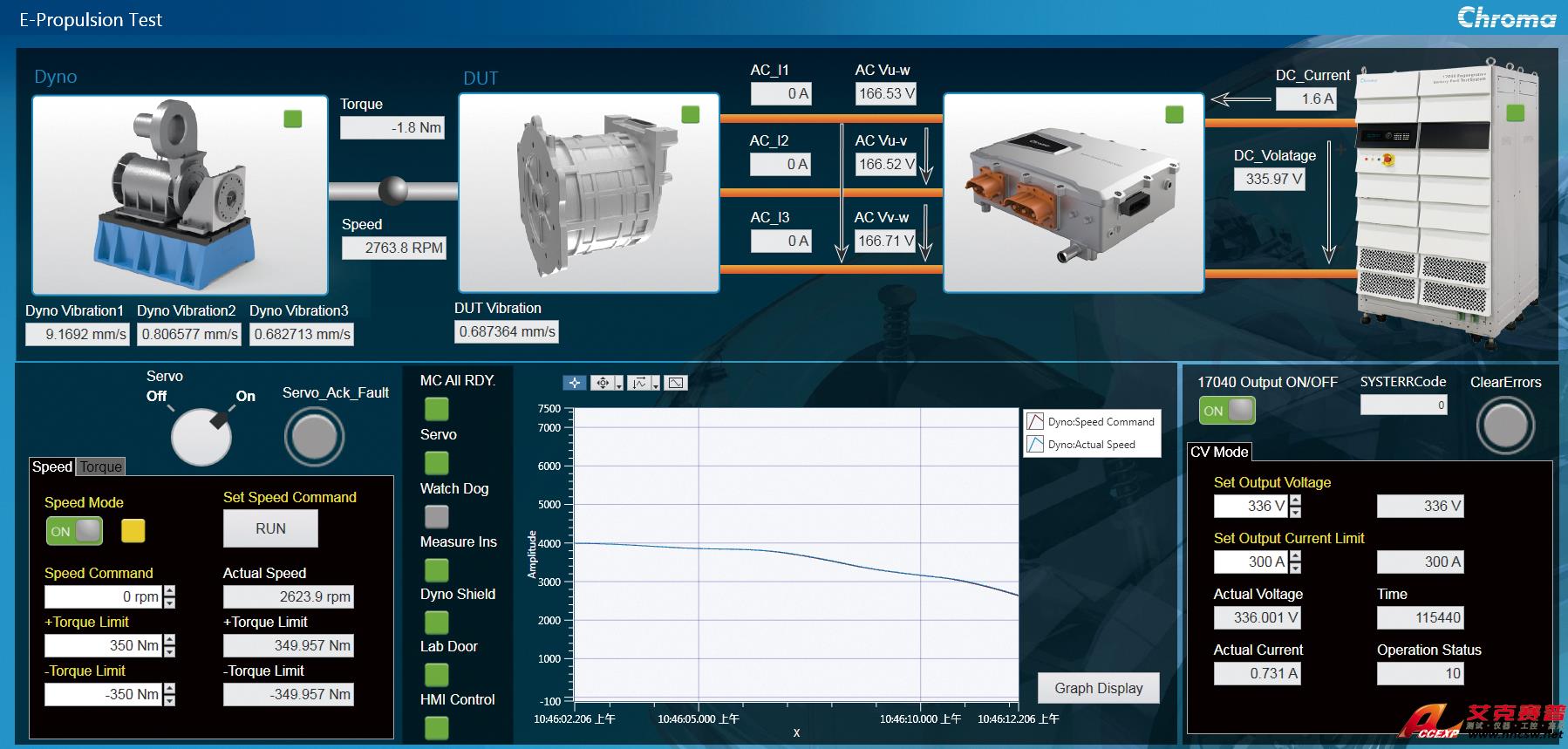 系統具有過流保護、過壓保護、欠壓保護、短路保護、電源缺相識別、系統溫度監控等保護機制及過載響應警告功能。其E-Propulsion Test 系統控制軟體具有載入DBC、關聯DBC、手動控制與監測資料等;測試介面可以實時顯示測試的瞬時值(電壓、電流、轉速、轉矩、輸入功率、輸出功率、效率、溫度等),并可按一定的時間(可設定) 采集數據。同時在測試過程中曲線繪制,產出報表,包含測試過程的曲線圖 (電壓、電流、轉速、轉矩、輸入功率、輸出功率、效率、溫度等)。系統采開放式軟體管理架構,具有快速連結試驗室相關測試及安全監控之設備能力,并配置振動監控模組,同步監控臺架與試驗件運行狀態,借以完成一體化實驗室整合及管理。