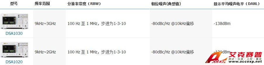 •顯示平均噪聲電平(DANL)-120dBm(DSA1020),-138 dBm(DSA1030)