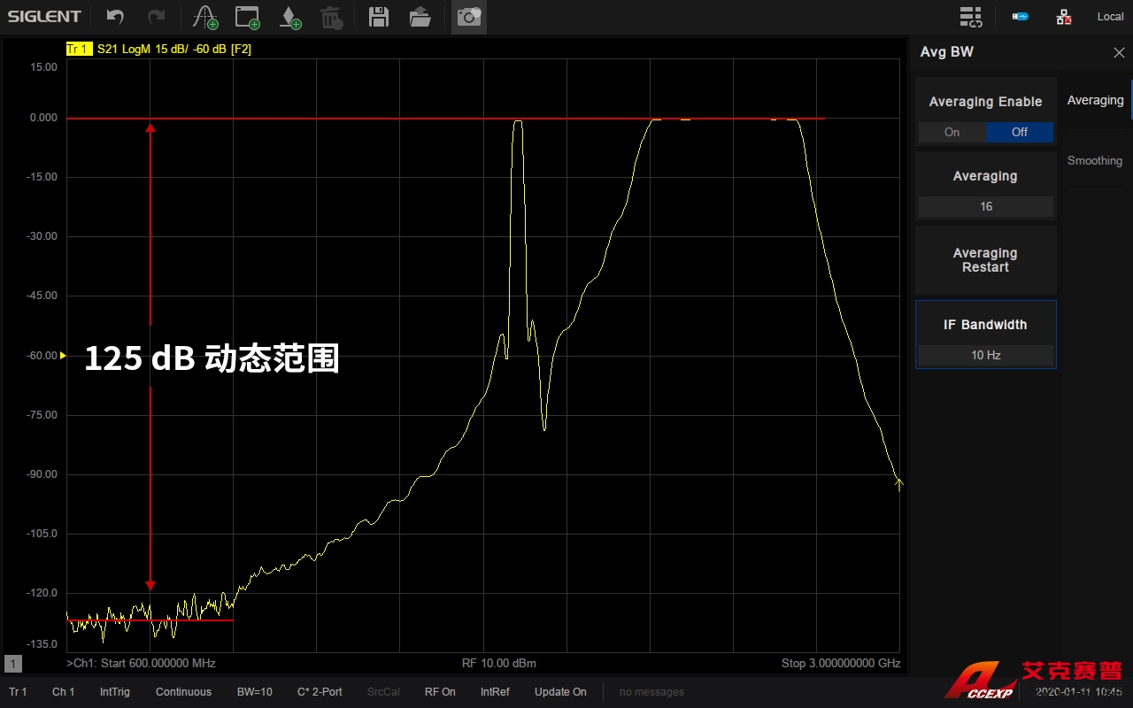 系統動態范圍是VNA一個非常重要的指標,它是VNA源的最大輸出功率與測試端口本底噪聲的差值。SNA5032A 擁有最大125 dB的動態范圍,可適用于對動態范圍要求比較高的測試場景,比如同時測量濾波器的通帶和帶外抑制性能。