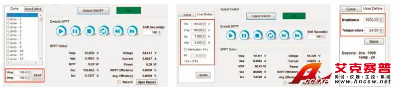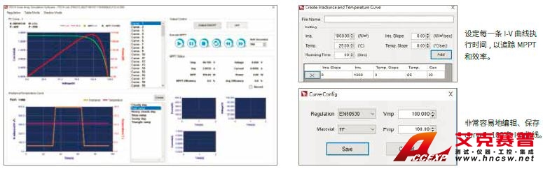 MPPT追蹤效能是光伏逆變器非常重要的規(guī)格,光伏逆變器需要內(nèi)建MPPT機(jī)制,實(shí)時(shí)地追蹤太陽電池最大輸出功率。因此業(yè)內(nèi)部分組織也定義了一些“標(biāo)準(zhǔn)”的測(cè)試形態(tài),以便對(duì)不同的逆變器按照相同標(biāo)準(zhǔn)來做比對(duì),對(duì)于MPPT效能進(jìn)行測(cè)試和提升。IT6000PV標(biāo)配的多通道太陽能電池矩陣仿真軟件內(nèi)置法規(guī)EN50530、SANDIA、NB/T32004、NB/T32004、CGC/GF004的MPPT 測(cè)試程序,用戶可以直接選取適宜的法規(guī),設(shè)置對(duì)應(yīng)的Vmp、Pmp、材料等參數(shù)、測(cè)試運(yùn)行時(shí)間以及運(yùn)行最大功率的百分比,屏幕上會(huì)顯示I-V 曲線和實(shí)時(shí)追蹤過程,驗(yàn)證光伏逆變器的最大功率點(diǎn)追蹤機(jī)制(MPPT)效能,并記錄測(cè)試追蹤過程的數(shù)據(jù),生成報(bào)表。